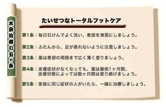 水虫治療の中心となるのが塗り薬です。薬を直接患部に塗ることで、白癬菌を殺したり、その発育を抑える目的で用います。塗り薬を用いる場合は、まず患部をよく洗い、皮膚表面の汚れを落とすことが大切です。また足水虫(足白癬)の場合は、特に以下の点に注意が必要です。
