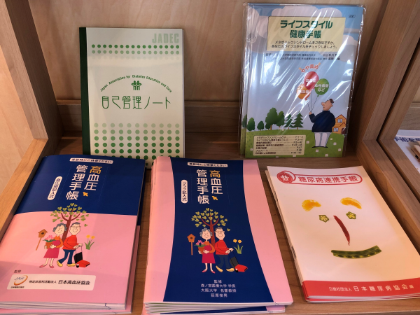血圧手帳、糖尿病連携手帳、糖尿病自己管理ノート、ライフスタイル健康手帳などがあります。血圧手帳は様々なものがありますので、ご自身のライフスタイルに合ったものをお使い下さい。ご不明な点があれば、ご遠慮なくスタッフまでお申し付け下さい。