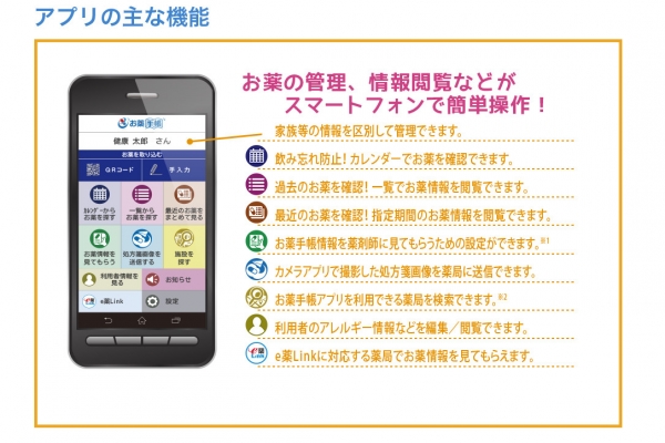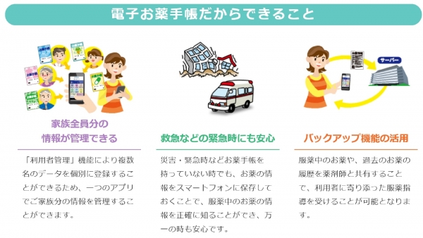 電子お薬手帳は、みなさまのお手持ちのスマートフォンなどにお薬の情報を保管し、紙のお薬手帳と同様に活用するために作られたものです。情報をサーバーに保管するので万一の災害や、紛失など、さまざまなシーンでの利用も期待されています。スマートフォンと連携していますので、飲み忘れ防止のアラーム機能など紙のお薬手帳にはない機能も活用できます。