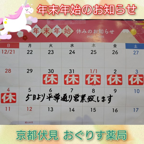 年末年始のお休みのお知らせ(京都伏見 おぐりす薬局) (2025/12/30更新)