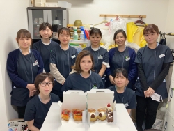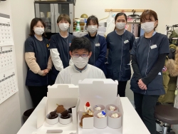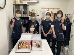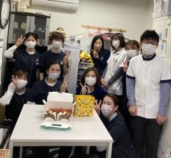 事務員Kさんの誕生日にみんなでケーキを囲んでお祝いしました。