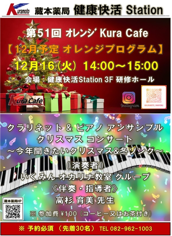 NEW 12月 第51回~オレンジ Kura Cafe 【クラリネット・ピアノ アンサンブル クリスマス コンサート】