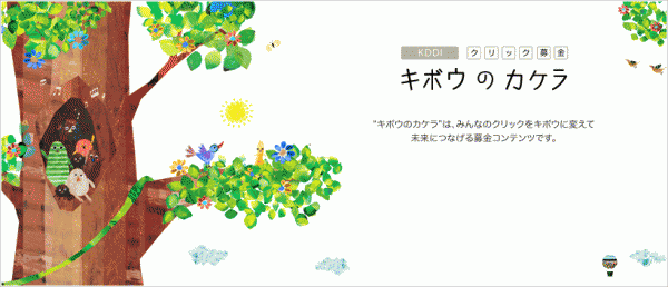 1つのやさしい気持ちのカケラが、たくさん集まるとキボウに変わる。そんな思いをこめた、クリック募金サイト“キボウのカケラ”。KDDIが支援するプログラムに賛同していただける方は、画面をクリックしてください。皆さまのクリックから生まれた “キボウのカケラ” に応じ、KDDIが皆さまの代わりに1クリックあたり1円を国際貢献活動を行うNGO団体などに寄付します。