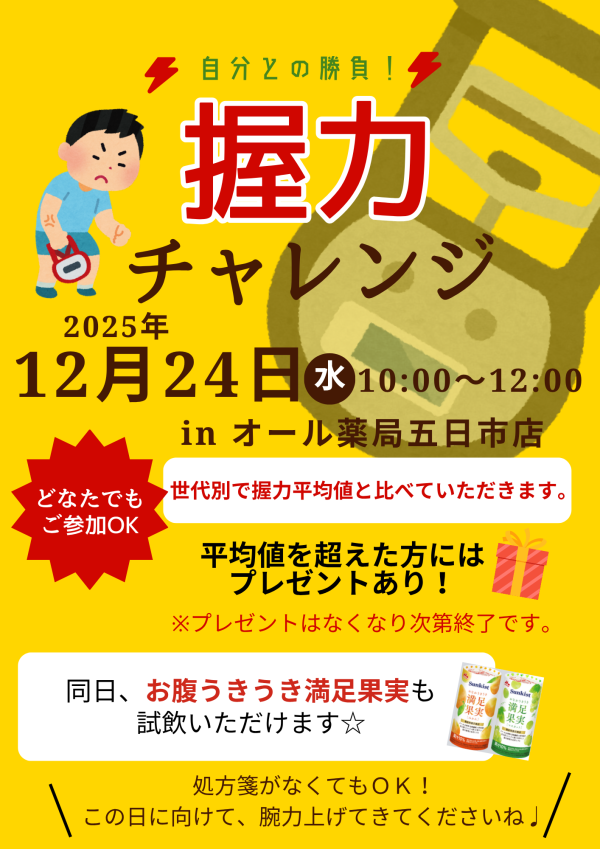 オール薬局五日市店で握力チャレンジイベントを行います。