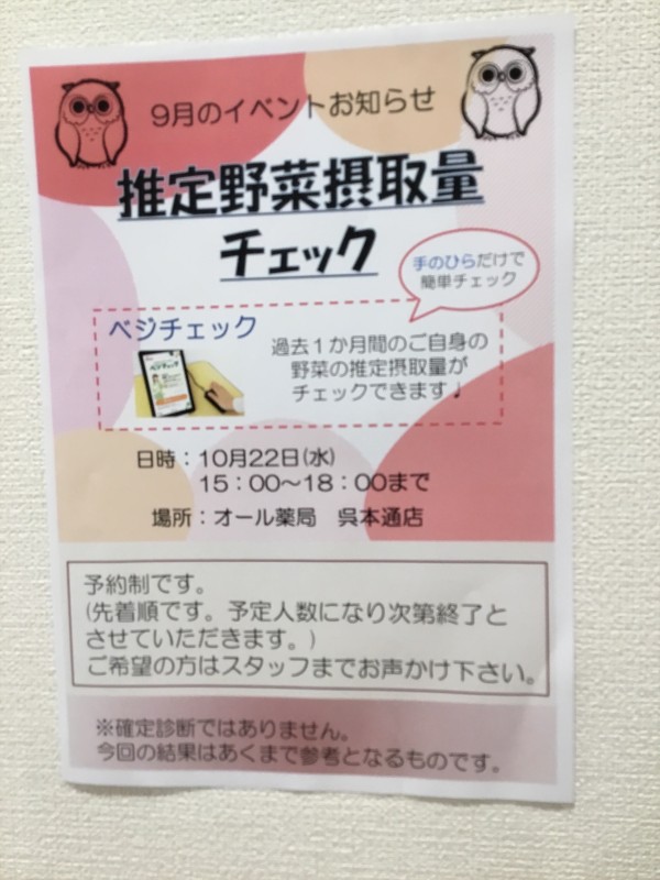 手のひらだけで簡単に測定できるベジチェックを使用し、過去1ヶ月間の野菜推定摂取量をチェック。予約者優先ですが、定員に達するまで参加できますので、スタッフにお声かけください。