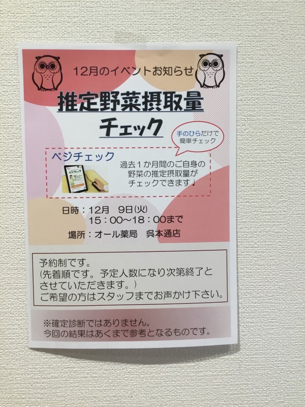 手のひらだけで簡単に測定できるベジチェックを使用し、過去1ヶ月間の野菜推定摂取量をチェック。予約者優先ですが、定員に達するまで参加できますので、スタッフにお声かけください。