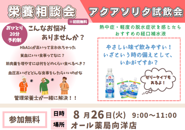 【8/26㈫】栄養相談会、アクアソリタ試飲会を開催します。