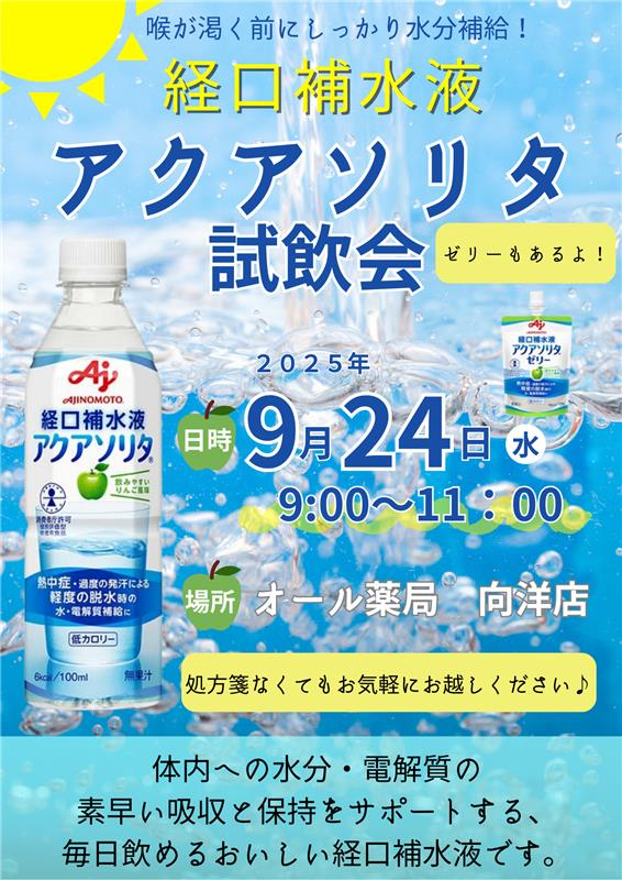 アクアソリタ、アクアソリタゼリーの販促キャンペーン期間中であるため、来局者の方に試飲していただき水分摂取の重要性について説明する予定です。