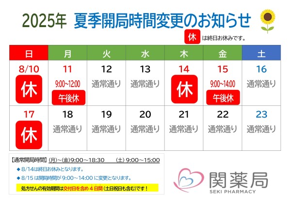 8/14(木)は終日お休みとなります。 8/15(金)は、開局時間が「9:00~14:00」に変更となります。 ご来局予定等ございましたら、お日にちやお時間に余裕をもってお越しいただけますよう何卒よろしくお願いいたします。