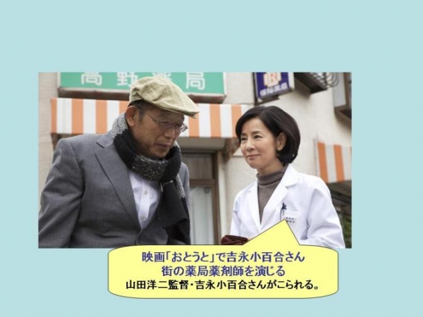 山田洋二監督と女優吉永小百合さんが来年1月全国ロードショーの『おとうと』の紹介でゲスト出演しました。監督からは、しっかりした姉とだめな弟という「寅さんシリーズ」と逆の設定を考えたとき小さな薬局を営みむ薬剤師の役を選んだこと、吉永さんから、薬科大学や調剤薬局で研修して役作りをしたエピソードを聞くことができました。