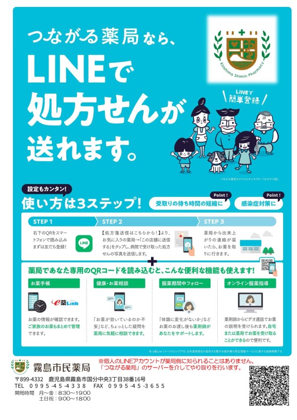 2. 【処方箋送信はこちらから!】より、「霧島市民薬局」を選択し、「この店舗に送信する」をタップし、病院で受け取った処方せんの写真を送信