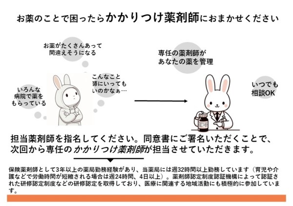 一人の薬剤師があなたの薬の情報などを把握し、治療をサポートすることになるのですが、これは予め患者さんから同意※を受けることにより、かかりつけ薬剤師としてのサポートが開始されます。(※同意書へのサインが必要になります。)