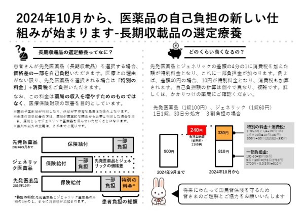 令和6年10月からの医薬品の自己負担の新たな仕組みとして、後発医薬品(ジェネリック医薬品)があるお薬で、先発医薬品の処方を希望される場合は、特別の料金をお支払いいただきます。