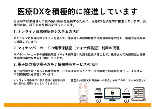 調剤薬局くすりの大福では、オンライン資格確認システムを通じて、患者様の診療情報・薬剤情報、特定健診情報等を取得し、調剤・服薬指導等を行う際に同意いただいた情報を閲覧し活用しています。