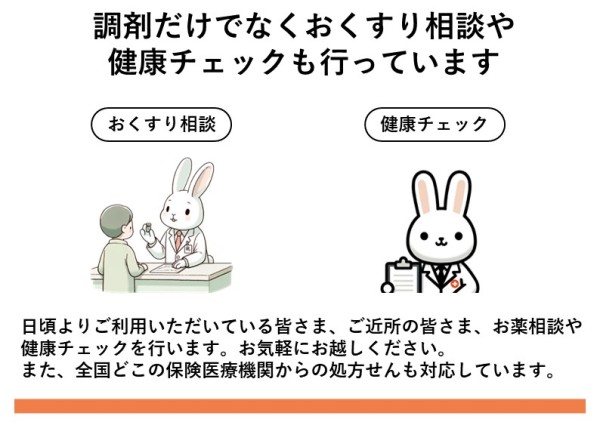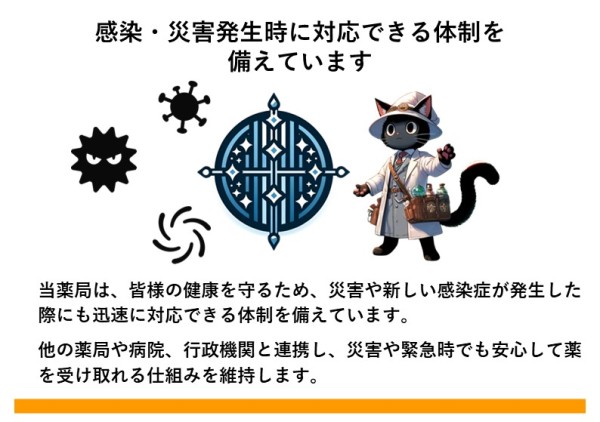 当薬局は、他の保険薬局等との連携により非常時における対応につき必要な体制を整備しております。