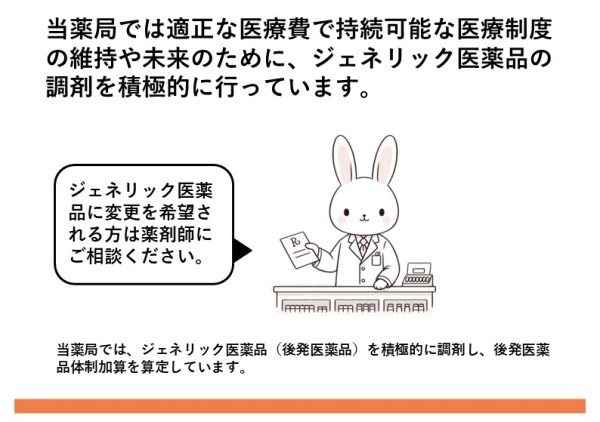医療費削減の観点、患者様の自己負担分の軽減の観点からジェネリック医薬品を推奨しています