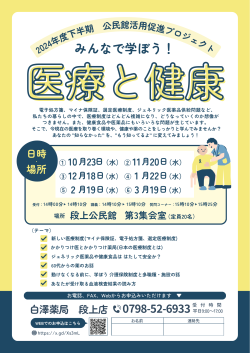 西宮市公民館活用促進プロジェクトの一環として、段上公民館にて「医療と健康」についての講座を、10月より毎月1回半年間行います。