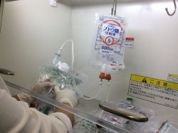 日々の業務の中で、輸液を必要とする患者様に向けて、薬剤師がクリーンベンチ業務を行っています。