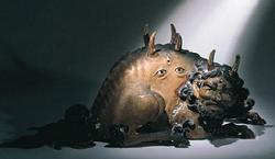 その姿は、人間の顔に獅子の胴体、竜の尾を持ち、顔・左右の胴に各3個ずつ計9個の眼、同じく各2個ずつ計6本の角を持つと言われています。