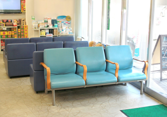 ドア横の椅子は立ち上がりの楽な特別なタイプです。