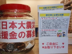 2011.03.17 募金箱と「被災時の知識」というリーフレットを出しました