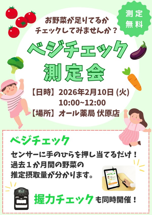 ・今回は、ベジチェック測定・握力測定と2機種測定いただける形としました。