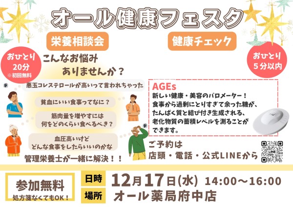 栄養相談は事前予約制、AGEs測定は予約不要で測定できます。