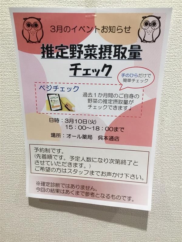手のひらだけで簡単に測定できるベジチェックを使用し、過去1ヶ月間の野菜推定摂取量をチェックできます。