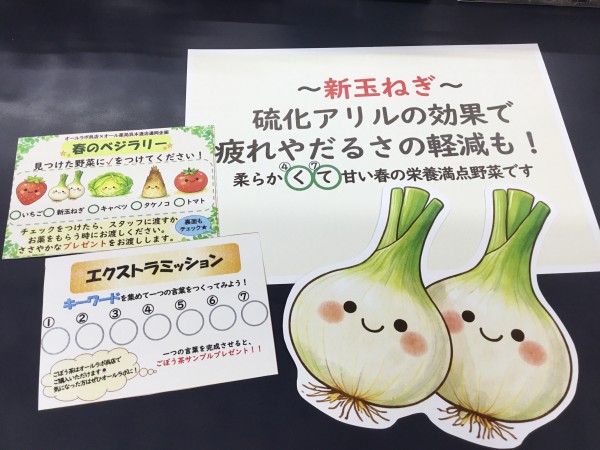 待合室内の各所に、春野菜をモチーフとしたイラストを掲示いたします。イラストの下には、それぞれの野菜の特徴や栄養に関する簡単な説明を記載しております。