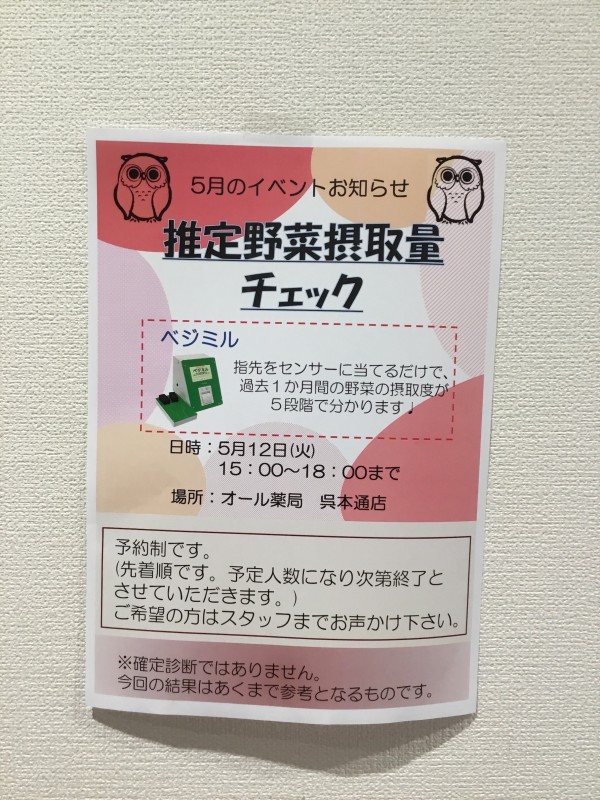 手のひらだけで簡単に測定できるベジミルを使用し、過去1ヶ月間の野菜推定摂取量をチェックできます。