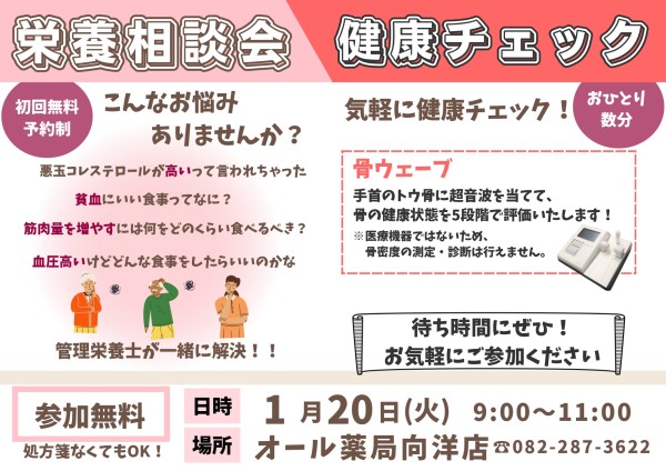1月20日(火)9:00~11:00に栄養相談会&健康チェックを開催します。