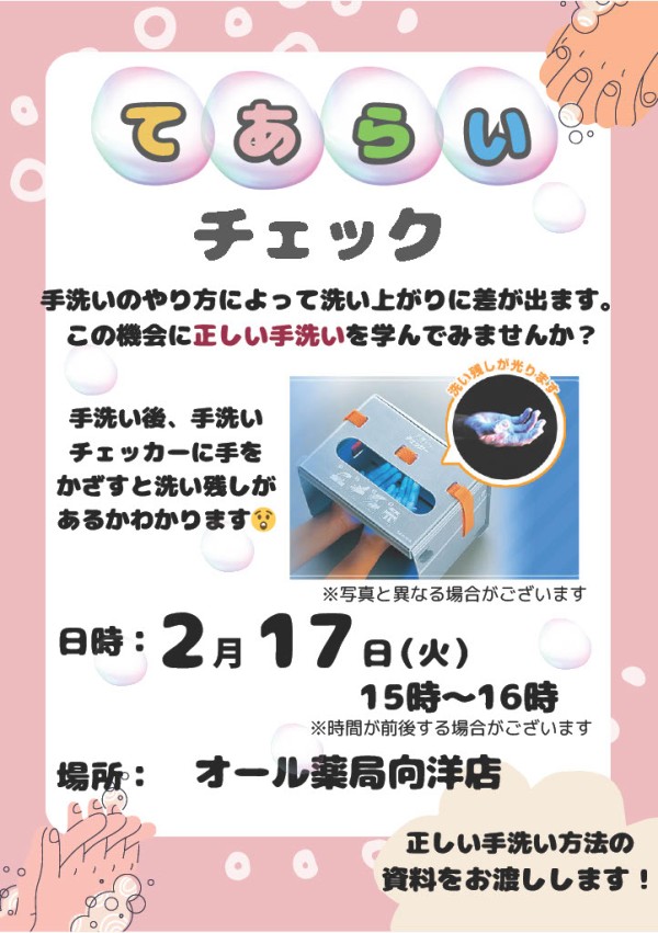 来局者のうち希望者に手洗いチェックを体験していただきます。