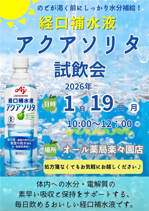 【1/19(月)】経口補水液アクアソリタ試飲会のお知らせ