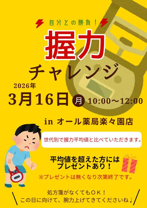 握力を測定して世代別の握力平均値と比べていただき、平均値を超えた方にはプレゼントがあります!!