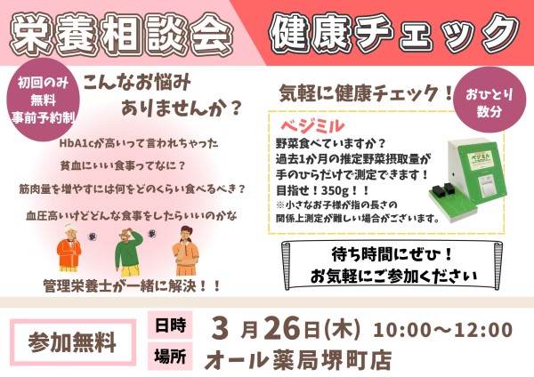 オール薬局堺町店にお越しいただいた方に対して、ベジミル測定を無料で実施いたします。併せて、栄養相談も初回無料で実施しております。