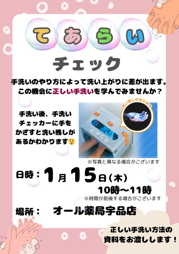 予約不要で、希望者の方に正しい手洗いが出来ているか体験していただけます。