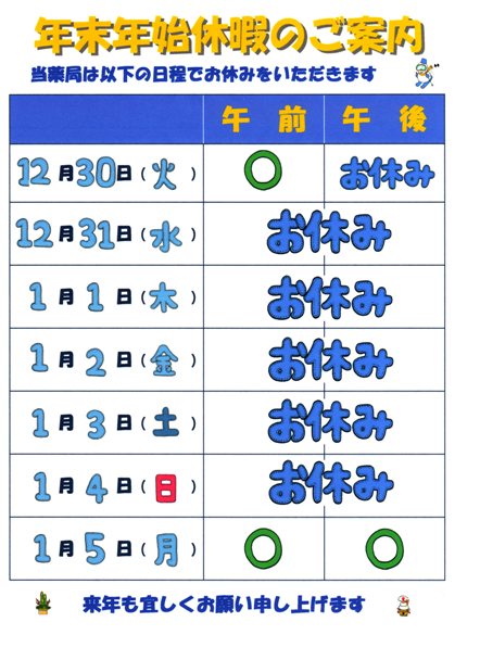 平成20年12月30日(火)午後~平成21年1月4日(日)までお休みになります。