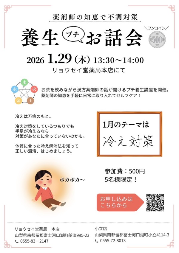 お悩みの冷えについて少数おしゃべりかい(お茶会)を1月29日の行います。