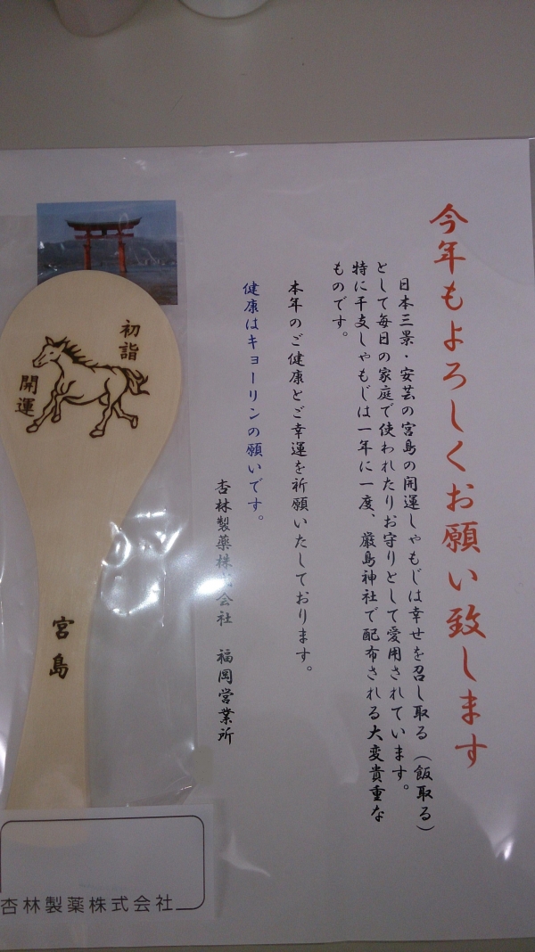 1月10日おはようございます。 今朝も寒いですね。 車で通勤していると雪もチラホラと。 週末も寒い日が続くようなので皆さんお気をつけて。 MRさんも今週から仕事始めで新年の挨拶にと何人か訪問がありました。 先日訪問された杏林さんから挨拶と一緒にしゃもじをいただきまし...