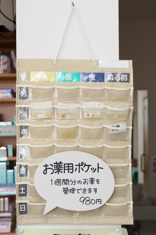 1週間分のお薬を1回分ごとに分けて入れられるとても便利なポケットです。マチ付きでお薬がある程度多い方でも対応可能です。便利な壁掛けタイプです。介護現場で役に立つとご家族やヘルパーさん等にご好評です。しっかりした作りで長く使用できます。お値段は980円です(税込み)