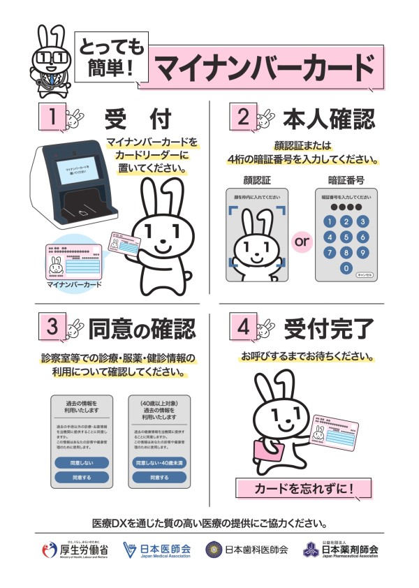 調剤の受付にある専用機にマイナンバーカードを置き、顔認証を行うことで簡単に操作ができます。